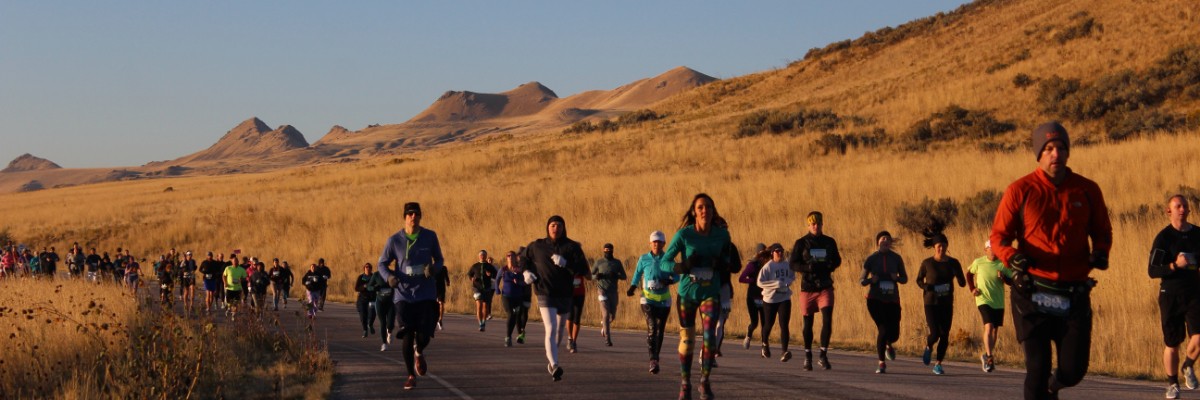 All the distances are on Antelope Island. Antelope Island is home to 600 bison and the largest island on the Great Salt Lake. This course is a true marathon in that it is not all downhill like many. There are several rollers for the runners. The views of the race have the Great Salt Lake to the East and Antelope Island mountain on the West.
